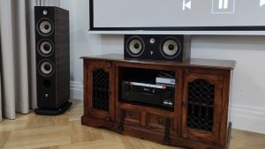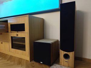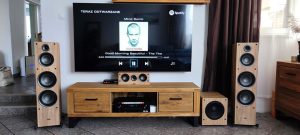 Instalacja kina minimalistycznego kina domowego w oparciu o soundbar pasywny Monitor Audio SB3 oraz głośniki Cabasse Eole4