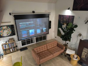 Instalacja kina domowego z ekranem i projektorem