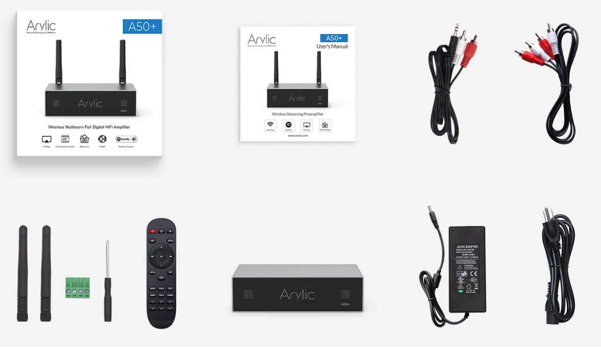 Bezprzewodowy wzmacniacz stereo A50+ zawiera wejście liniowe stereo RCA, wejście optyczne, Micro USB, USB A, RJ45 Lan (Ethernet), wyjście głośnikowe (w zestawie 4-przewodowe złącze Phoenix), wyjście Sub, Wi-Fi i Bluetooth 5.0.