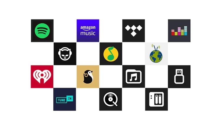 Spotify, Amazon Music, Tidal, Qobuz, Deezer, Napster, TuneIn, Radio internetowe, Radio iHeart, QQ Music, QQ FM.