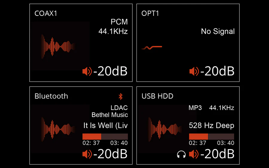 Na tylnym panelu znajdują się wejścia cyfrowe: 2 x Coax (SPDIF), 2 x Optical, USB-B (PC), USB-A (HDD) oraz profesjonalne AES3/EBU. Moduł Bluetooth 5.1 obsługuje kodeki aptX, aptX HD oraz LDAC, umożliwiając bezprzewodowy streaming wysokiej jakości.