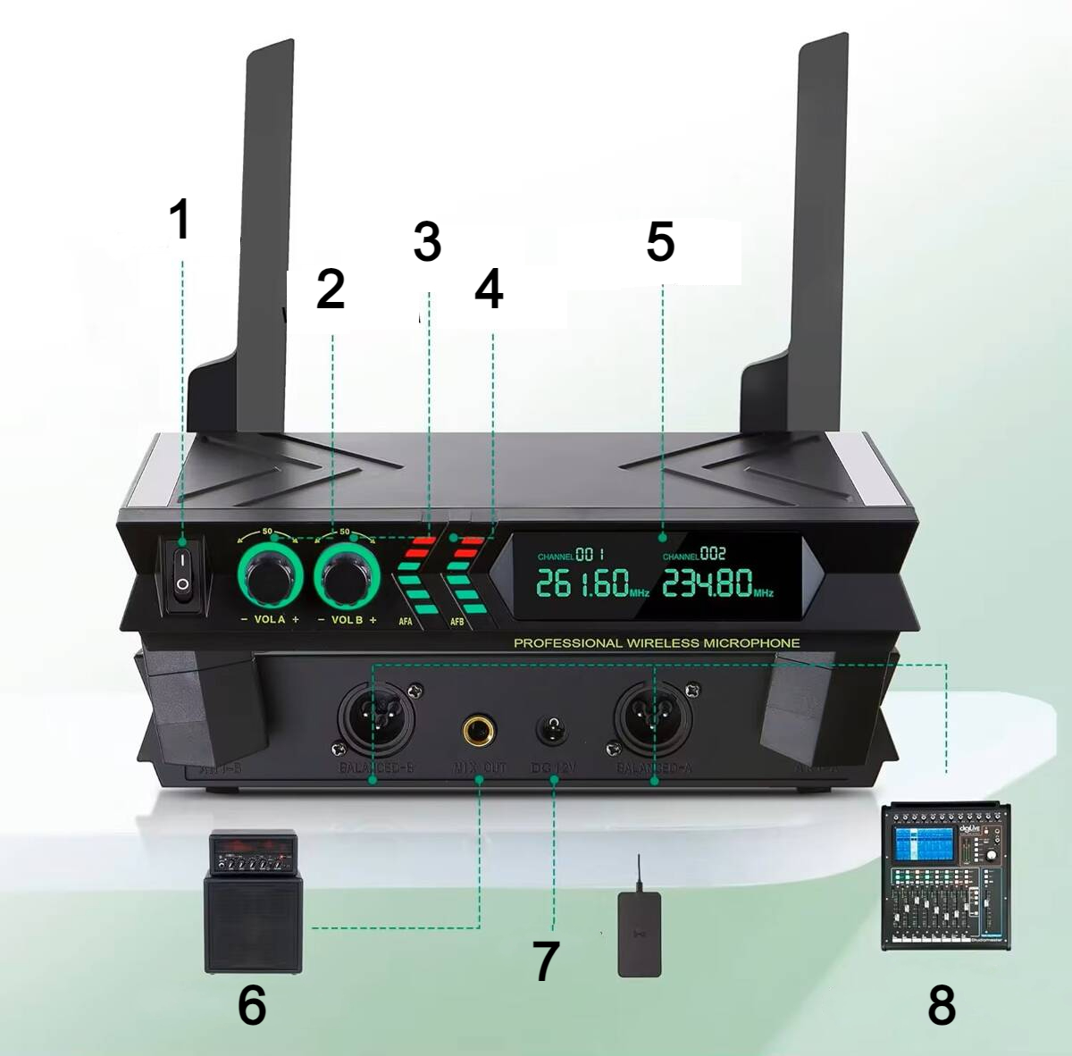 - Odbiornik: wskaźnik włączenia/wyłączenia, regulacja głośności, wskaźnik RF, włącznik/wyłącznik, antena odbiornika, złącze kabla zasilającego, zbalansowane gniazdo wyjściowe, gniazdo wyjściowe audio. Wskaźnik LED zasilania, wejścia sygnału i AF.