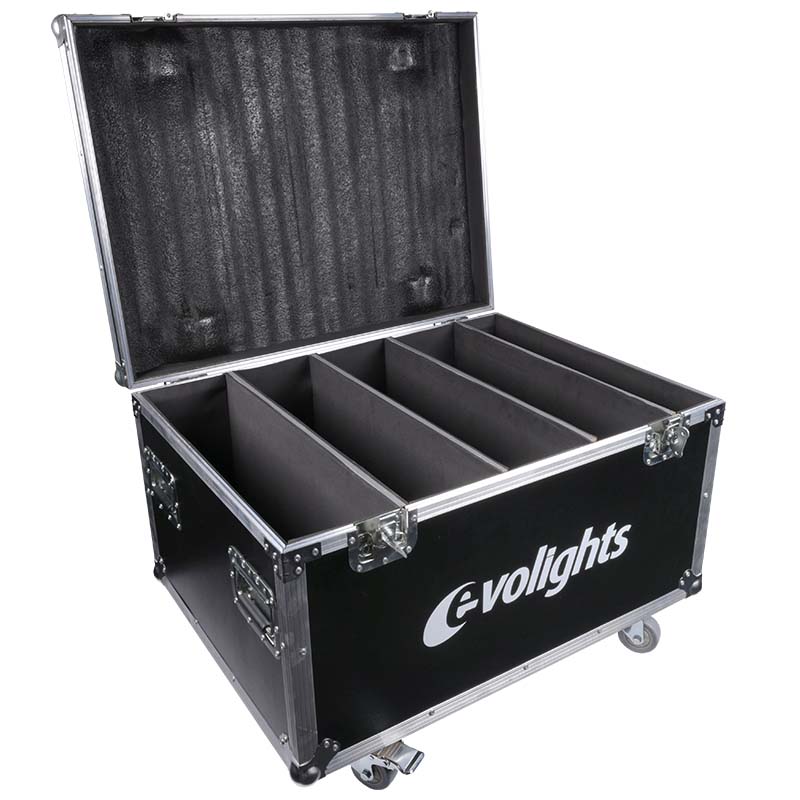 Prezentowany case na oświetlacze zewnętrzne Evolights 60x10W RGBW LED Wall Washer IP65 to ✅ profesjonalna i bardzo solidnie wykonana skrzynia transportowa marki Evolights z miejscem na 4 jednostki tego typu lub inne urządzenia o podobnych do tych naświetlaczy wymiarach. Kontener wykonany został z grubej, 7-milimetrowej sklejki pomalowanej specjalną, wodoodporną farbą. Jego krawędzie wzmocnione zostały aluminiowymi profilami. Na narożnikach znajdują się kulowe, chromowane osłony dodatkowo zabezpieczające konstrukcję oraz chroniące samo otoczenie skrzyni dzięki wyeliminowaniu ostrych krawędzi.
