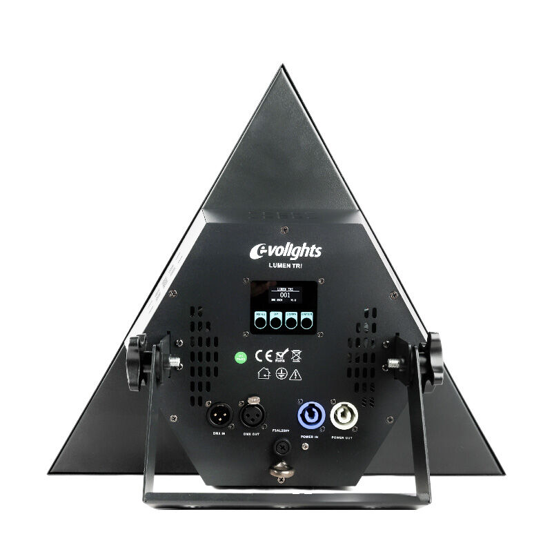 Evolights Lumen Tri posiada stylową, czarną obudowę z trókątną, efektowną kratownicą, która bardzo dobrze prezentuje się na scenie. Reflektor jest nowoczesny, a jednocześnie nawiązuje do klasycznych wzorców sprzed kilku dekad. Solidna obudowa została wyposażona w wytrzymały uchwyt montażowy umożliwiający instalację oświetlacza na statywach, kratownicach i rampach oświetleniowych. Z tyłu znajduje się wygodny panel sterowania z czytelnym wyświetlaczem OLED i 4 przyciskami dotykowymi oraz wejście/wyjście powercon, które umożliwiają przekazywanie napięcia zasilającego bezpośrednio z jednego urządzenia do drugiego ✅. Klasa IP20, stosunkowo kompaktowe wymiary i niewielka waga sprawiają, że urządzenie jest bezpieczne w użytkowaniu, a także łatwe do transportowania oraz przechowywania. Kontrola podświetlenia wyświetlacza oraz opcja wyświetlenia czasu pracy urządzenia to dodatkowe atuty, które zwiększają funkcjonalność i wygodę użytkowania.