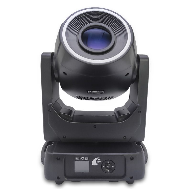 Evolights Neo Spot 200W to profesjonalna, ruchoma głowica estradowa LED, której źródłem światła jest dioda LED o mocy 200 watów i temperaturze barwowej na poziomie 8500 Kelwinów oraz pierścień LED świecący w palecie kolorów RGB. Głowa wyposażona jest w tarczę 8 kolorów, dwie tarcze gobo z 7 statycznymi oraz 9 rotacyjnymi, nowoczesnymi wzorami kształtującymi promień świetlny, a także obrotowy pryzmat rozszczepiający wiązkę. Ostrość plamy świetlnej może być regulowana za pomocą elektronicznego focusa. Głowica świetnie spisuje się na muzycznych scenach, podczas przedstawień i pokazów, w klubach tanecznych i dyskotekach, a także jako dynamiczne oświetlenie dla zespołów weselnych i mobilnych DJ-ów ✅.
