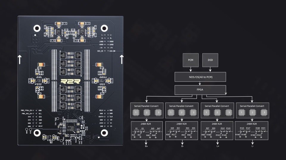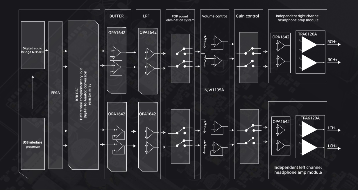 Od przetwornika DAC, przez filtr dolnoprzepustowy (LPF), regulację głośności, aż po wzmacniacz słuchawkowy – cały tor audio w K13 R2R jest w pełni różnicowy. Taka konstrukcja zapewnia minimalne zniekształcenia, skuteczne tłumienie zakłóceń oraz zachowanie pełnej dynamiki na każdym etapie sygnału. Dodatkowe funkcje, takie jak regulacja wzmocnienia, ochrona słuchawek i eliminacja trzasków przy włączaniu (POP noise), sprawiają, że układ jest nie tylko czysty brzmieniowo, ale też bezpieczny w użytkowaniu.