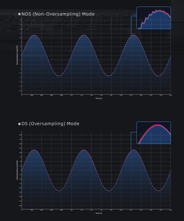 Tryb OS (Oversampling) – globalnie podnosi częstotliwość próbkowania do 384kHz, zapewniając wyższą jakość dźwięku, większą klarowność i precyzję w reprodukcji detali.