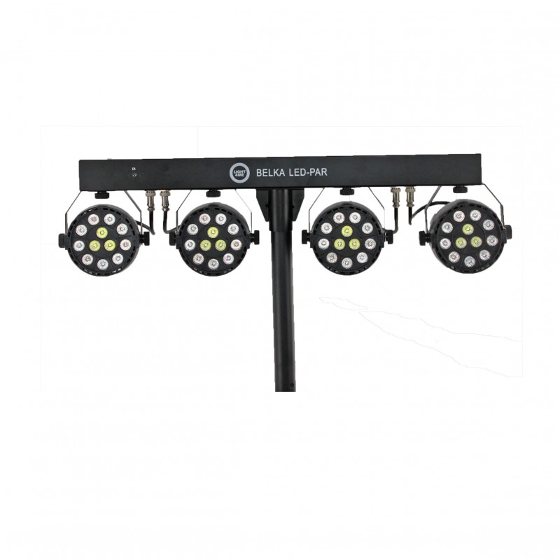 LIGHT4ME BELKA LED PAR to kompletny zestaw oświetleniowy, w skład którego wchodzą listwa mocująca, cztery reflektory LED PAR wyposażone w 12 jednowatowych diod LED pracujących w palecie kolorów RGBW (red, green, blue, white), solidny statywpilot oraz dwa pokrowce (na statyw i belkę).