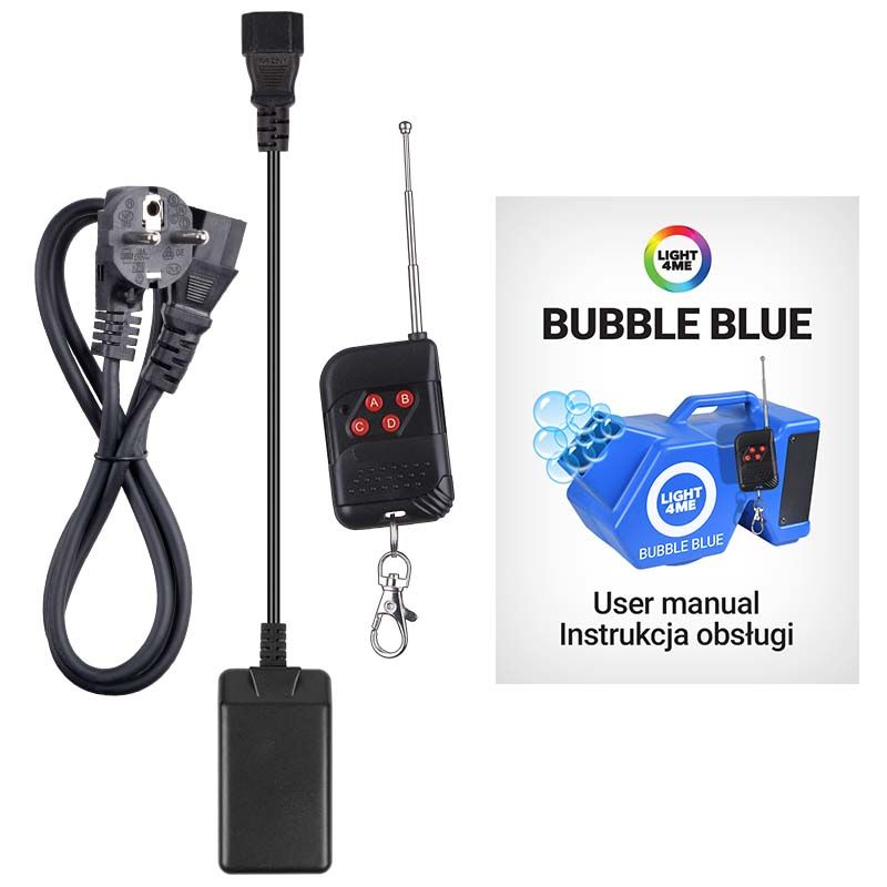 - W zestawie: wytwornica baniek, przewód zasilający IEC, pilot bezprzewodowy, odbiornik radiowy, instrukcja obsługi (EN/PL)
