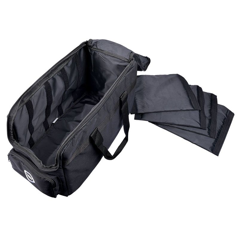 Light4Me PAR BAG to profesjonalny pokrowiec na led pary mogący pomieścić 4 reflektory typu slim lub większe oświetlacze oraz dodatkowe akcesoria, takie jak kontroler DMX czy przewody. Ochraniacz w całości wykonany został z czarnej, nieprzemakalnej kodury. Dzięki temu jest odporny na przetarcia i łatwo się go czyści. Jego wypełnienie stanowi 8-milimetrowa gąbka techniczna ✅ skutecznie chroniąca nasz sprzęt przed uszkodzeniem. W środku pokrowca znajduje się 5 komór. Rozdzielają je usztywniane przegrody przyczepiane do wewnętrznych ścian torby na rzepy. Takie rozwiązanie pozwala odpowiednio dostosować wnętrze torby do rozmiarów naszego oświetlenia. Możemy użyć wszystkich przegród i przygotować miejsce dla 4 reflektorów typu slim, lub wyjąć odpowiednie przegrody i zmieścić w środku znacznie większe urządzenia.