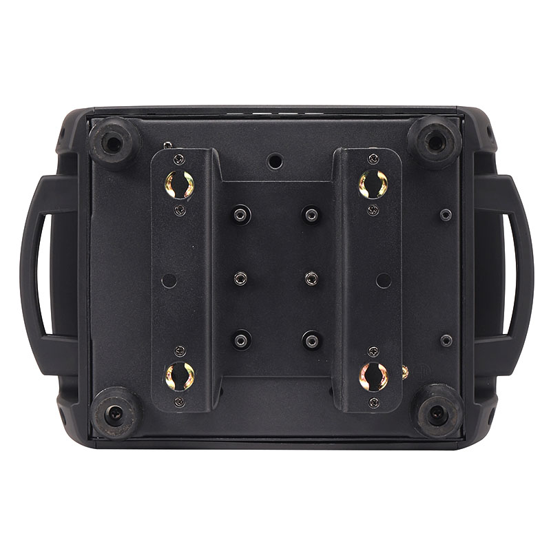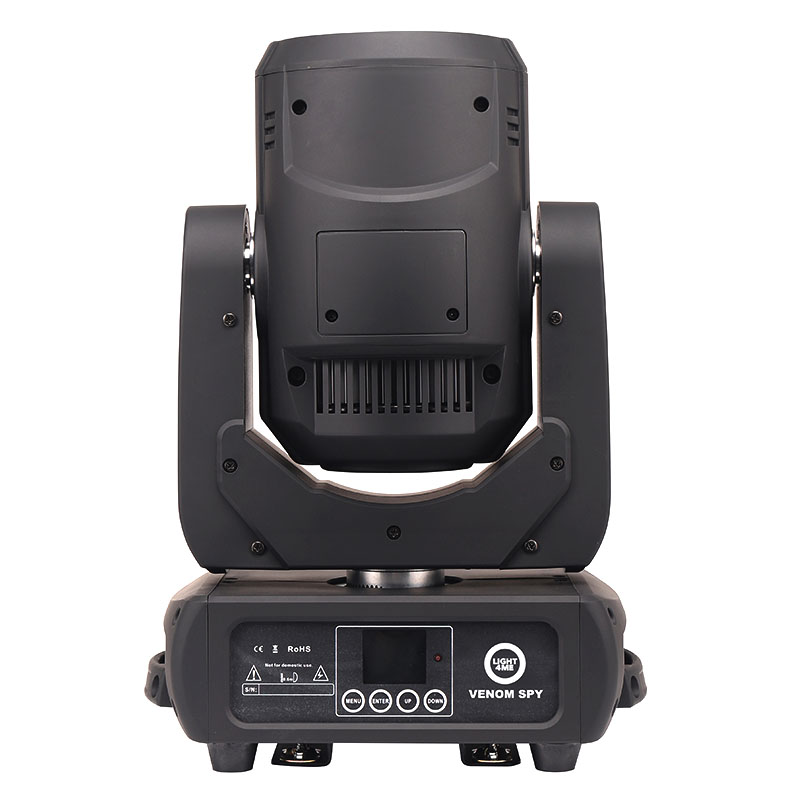 Dolna część VENOM SPOT 150 SPY RING wyposażona została w dwie szybkozłączki, umożliwiające ruchomej głowicy pracę na rampach oświetleniowych i kratownicach w pozycji wiszącej. Do wygodnego i bezpiecznego przenoszenia zastosowano solidne uchwyty znajdujące się po obu stronach podstawy reflektora scenicznego. W tylnej części umieszczone zostały złącza zasilania, w tym tzw. „podaj dalej” umożliwiające przekazywanie napięcia bezpośrednio z urządzenia do urządzenia, oraz wejścia i wyjścia XLR dla sygnałów sterujących DMX. W części przedniej znajduje się panel sterowania w postaci czytelnego, kolorowego wyświetlacza LCD oraz czterech przycisków (Menu, Enter, Up, Down). Za ich pomocą możemy wybrać jeden spośród kilku trybów pracy urządzenia: