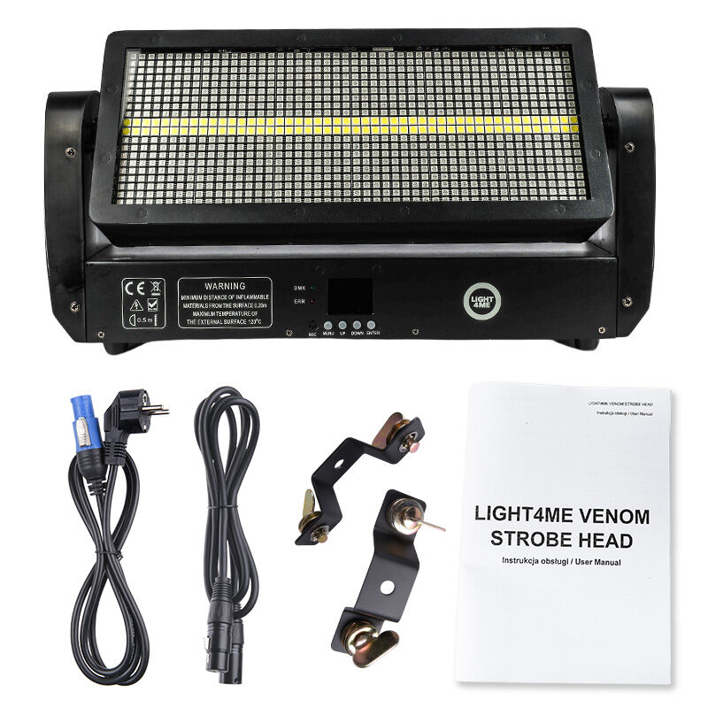 Light4Me Venom Strobe Head to profesjonalny, świetnie wykonany stroboskop estradowy LED o dużej mocy i klasie IP20 ✅. Urządzenie znakomicie sprawdza się na małych i średniej wielkości scenach, stanowiąc jeden z elementów oświetlenia scenicznego. Jego głównym zadaniem jest doświetlanie, a także tworzenie rozbłysków podczas występów artystycznych. Może być również z powodzeniem wykorzystywany do dekoracji światłem lub jako oświetlenie architektoniczne.