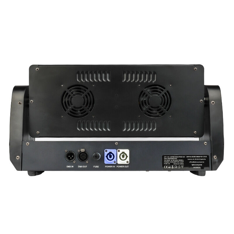 Urządzenie może pracować w pozycji stojącej, a dodatkowo na spodzie obudowy stroboskopu estradowego znajdują się otwory montażowe dla dwóch, trwałych, dołączonych do zestawu uchwytów montażowych, umożliwiających instalację oświetlacza na kratownicach i rampach oświetleniowych ✅. W części tylnej znajdują się gniazda zasilania wejścia i wyjścia powercon, wejście i wyjście dla sygnału DMX. W części przedniej jest umieszczony panel sterowania w postaci cyfrowego wyświetlacza LED i czterech przycisków (Menu, Up, Down, Enter). Za jego pomocą możemy wybrać jeden z czterech trybów pracy oświetlacza: