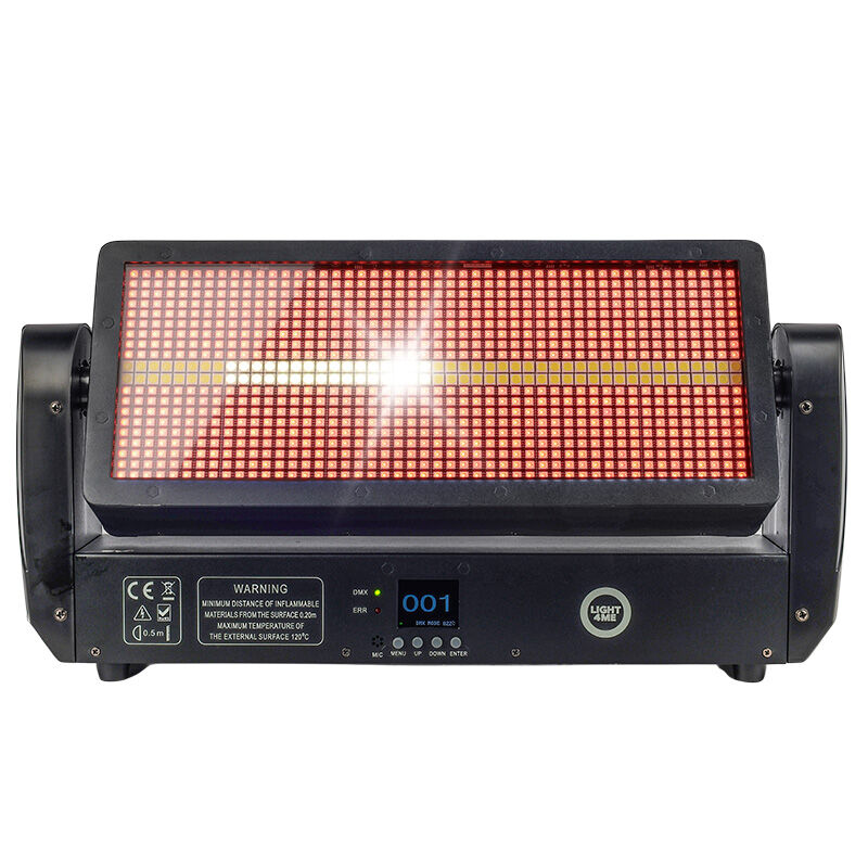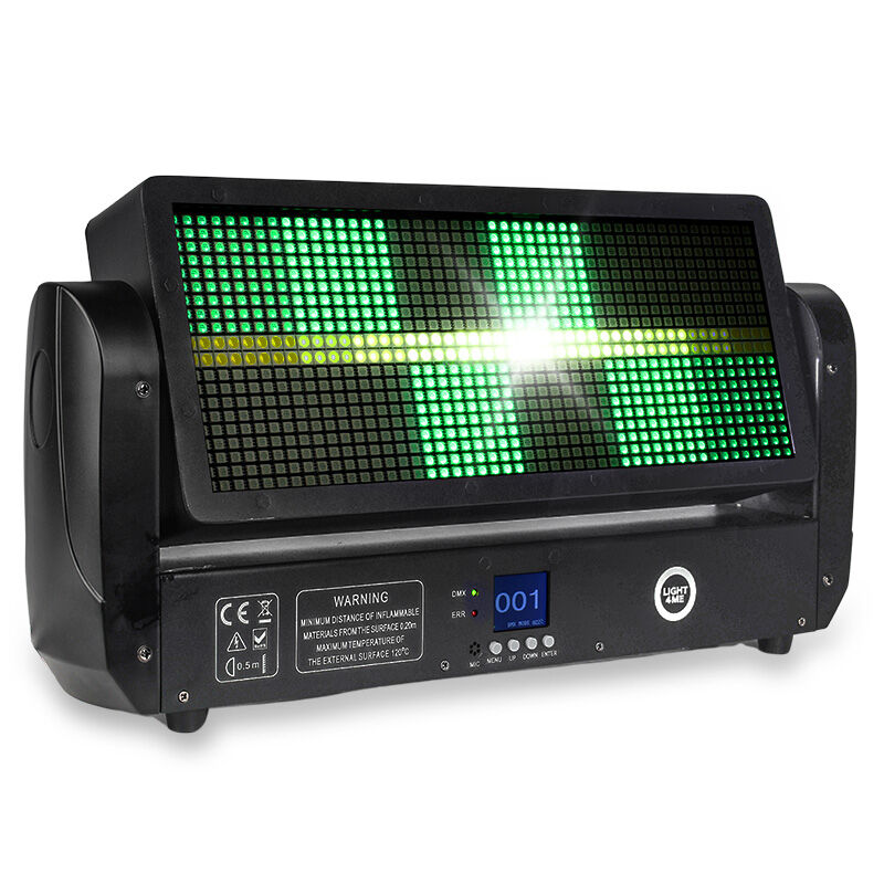 Komponenty blindera zostały zamknięte w solidnej, metalowej obudowie. Jej główną część stanowi panel świetlny operujący światłem w palecie barw RGB+CW (czerwony, zielony, niebieski, zimny biały) ✅. W jego skład wchodzi układ 864 diod LED (RGB) o mocy 0,3 wata, które są rozmieszczone w 12 sekcjach po 72 sztuki w górnej i dolnej części panelu świetlnego. Dodatkowe źródło światła stanowi poprzeczna listwa w centrum panelu świetlnego, na której znajduje się 96 diod LED (zimna biel) o mocy 1 wata rozmieszczonych w 12 sekcjach po 8 sztuk. Panel świetlny został zainstalowany między wytrzymałymi ramionami urządzenia, które zapewniają możliwość poruszania panelem świetlnym w płaszczyźnie pionowej (Tilt). Ruchy Tilt panelu świetlnego można odwrócić w dowolnym momencie za pomocą menu urządzenia, podobnie jak orientację wyświetlacza, gdy wymaga tego sytuacja!