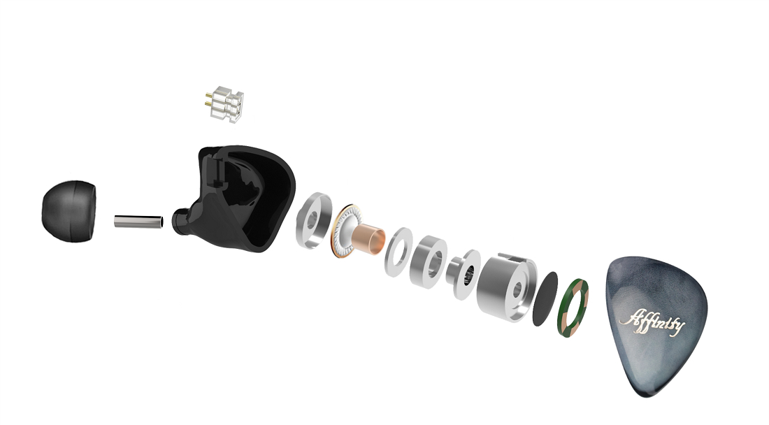 Queen Of Audio Affinity to najnowszy model monitorów dousznych z pojedynczym przetwornikiem dynamicznym – po każdej stronie znajduje się duży przetwornik dynamiczny o średnicy 10 mm. Ten dynamiczny przetwornik wyposażony jest w wysokiej jakości cewkę membranową PEN pokrytą tytanem, zapewniającą niezrównaną jakość dźwięku. Słuchawki wytwarzają imponujący dźwięk z głęboką odpowiedzią basową, bogatym wokalem i bardzo szczegółowymi, lśniącymi górnymi rejestrami. Afinity przyjmuje konstrukcję z wbudowanym kanałem akustycznym ze stali nierdzewnej z systemem Dual-Layered Resonance Control (DLRC), który zapewnia mniejsze zniekształcenia w sygnale wyjściowym.