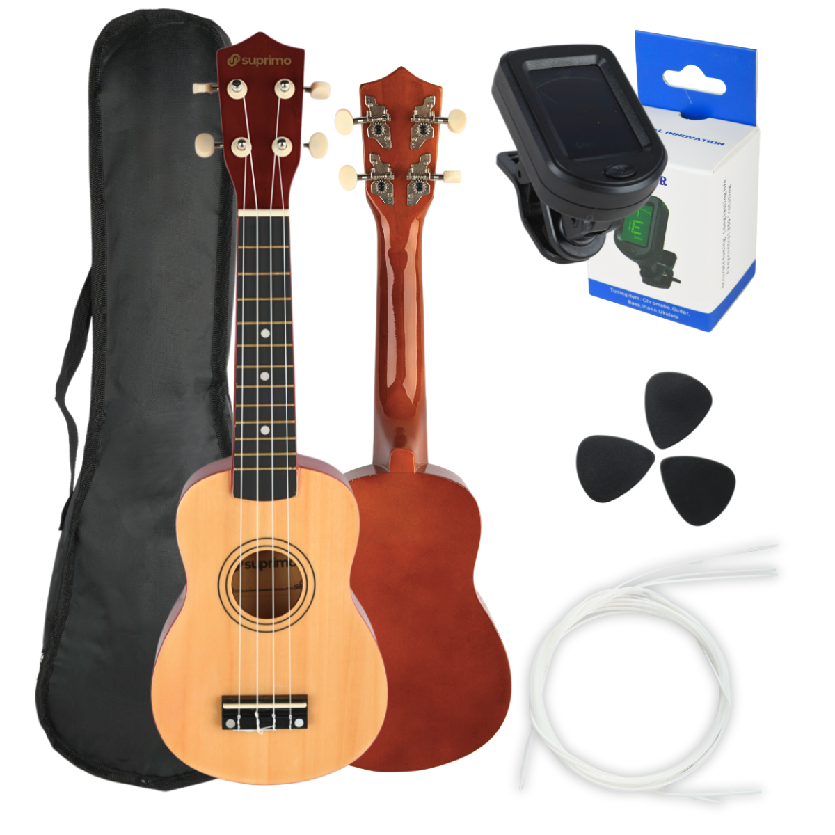 SUPRIMO UK21 SET  NW ukulele sopranowe 21" naturalne drewniane pokrowiec 3 kostki do gry zapasowe struny tuner zestaw dla dzieci do nauki gry